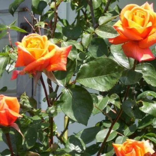 Цветение — главное достоинство сорта. Бутоны раскрываются в крупные (до 12 см в диаметре), густомахровые цветы с классической бокаловидной формой. В зависимости от фазы роспуска лепестки варьируются от теплого кораллового до насыщенного оранжево-розового оттенка. Аромат отчетливый, мягкий, с фруктовыми и цветочными нотками. Цветы чаще одиночные, иногда собраны по 2–3 на побеге. Роза зацветает в июне и повторяет волны цветения до октября.